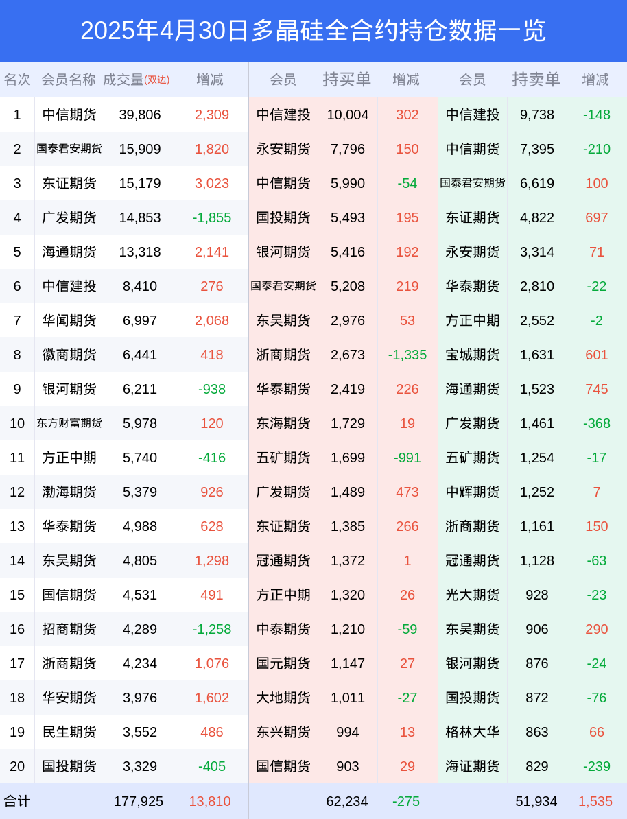 多晶硅期货全合约总计成交15.27万手,比上一日新增1.39万手。全合约前20席位多头持仓6.67万手,比上一日减少432手。全合约前20席位空头持仓5.76万手,比上一日增加2444手。