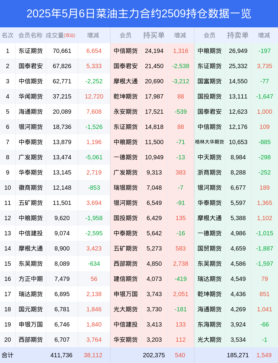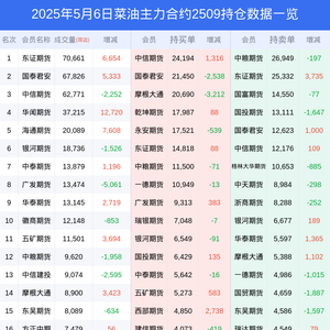 新浪期货 根据交易所数据,截至5月06日收盘主力合约菜油2509,涨跌-0.60%,成交量29.97万手,持仓数据显示前20席位呈现净多,差额头寸为17104手。