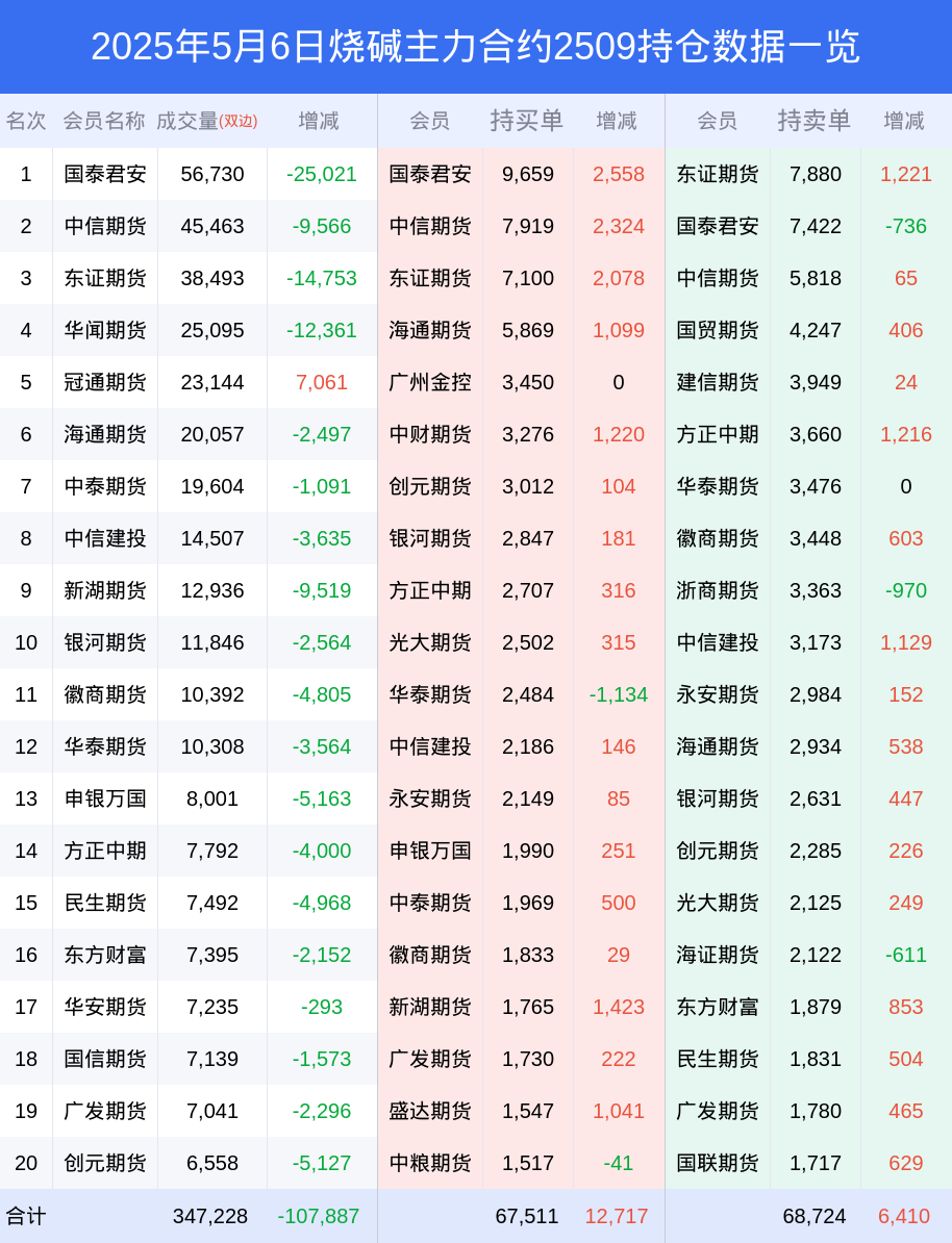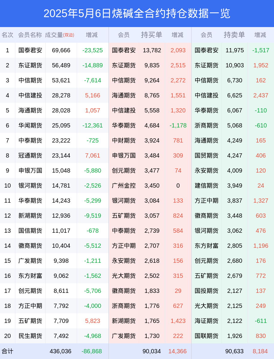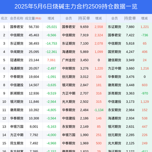 新浪期货 根据交易所数据,截至5月06日收盘主力合约烧碱2509,涨跌+1.75%,成交量26.75万手,持仓数据显示前20席位呈现净空,差额头寸为1213手。