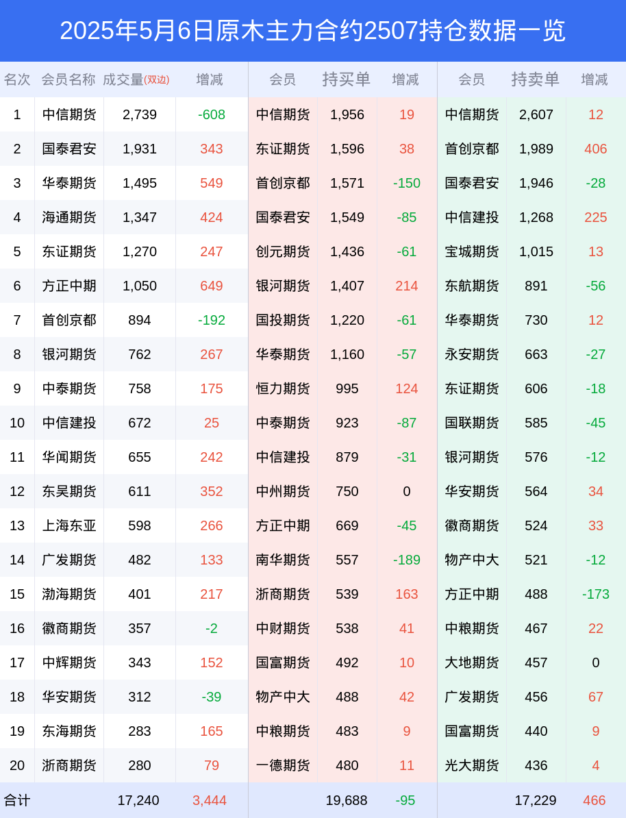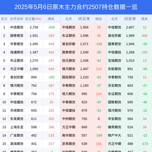 新浪期货 根据交易所数据,截至5月06日收盘主力合约原木2507,涨跌+0.45%,成交量1.25万手,持仓数据显示前20席位呈现净多,差额头寸为2459手。