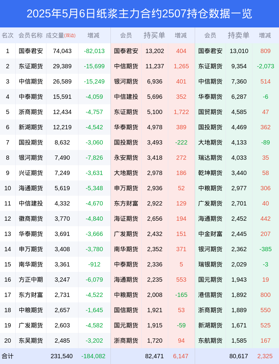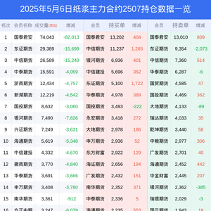 新浪期货 根据交易所数据,截至5月06日收盘主力合约纸浆2507,涨跌-1.68%,成交量15.00万手,持仓数据显示前20席位呈现净多,差额头寸为1854手。