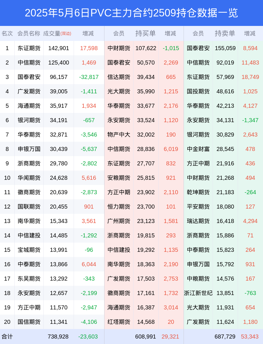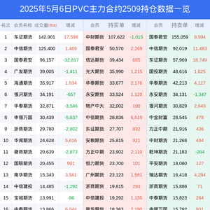 新浪期货 根据交易所数据,截至5月06日收盘主力合约PVC2509,涨跌-1.54%,成交量54.25万手,持仓数据显示前20席位呈现净空,差额头寸为78738手。