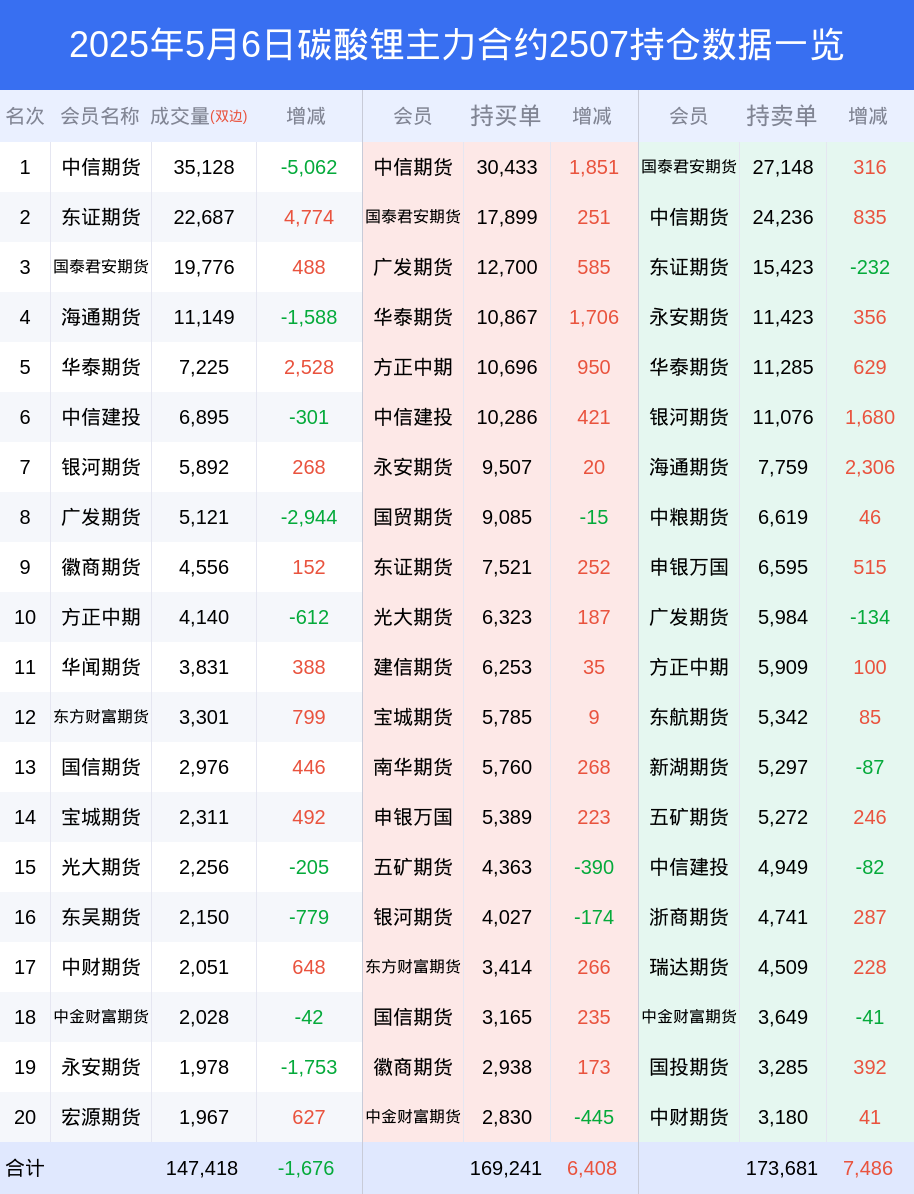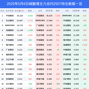 新浪期货 根据交易所数据,截至5月06日收盘主力合约碳酸锂2507,涨跌-1.51%,成交量10.40万手,持仓数据显示前20席位呈现净空,差额头寸为4440手。