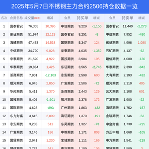 新浪期货 根据交易所数据,截至5月07日收盘主力合约不锈钢2506,涨跌+0.08%,成交量18.09万手,持仓数据显示前20席位呈现净空,差额头寸为1749手。