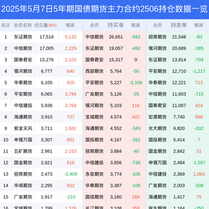 新浪期货 根据交易所数据,截至5月07日收盘主力合约5年期国债期货2506,涨跌-0.08%,成交量6.23万手,持仓数据显示前20席位呈现净空,差额头寸为14102手。