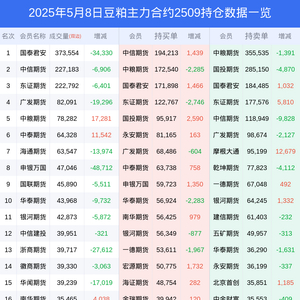新浪期货 根据交易所数据,截至5月08日收盘主力合约豆粕2509,涨跌+0.07%,成交量117.67万手,持仓数据显示前20席位呈现净空,差额头寸为368313手。
