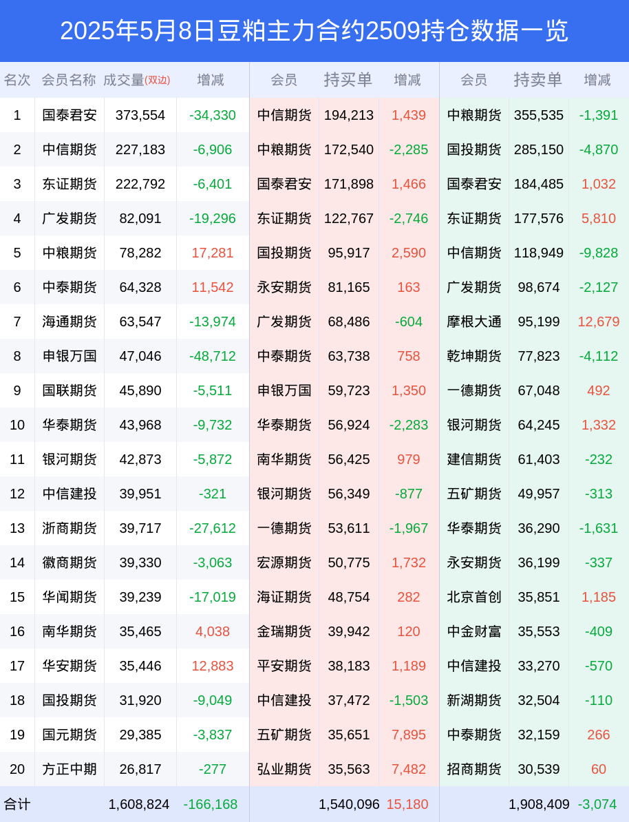 根据合并数据显示,多头前三席位为国泰君安,总持仓407432、中信期货,总持仓362029、中粮期货,总持仓215353;空头前三席位为中粮期货,总持仓517466、国泰君安,总持仓443576、国投期货,总持仓431022;