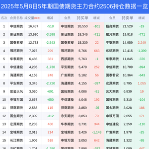 新浪期货 根据交易所数据,截至5月08日收盘主力合约5年期国债期货2506,涨跌+0.16%,成交量5.39万手,持仓数据显示前20席位呈现净空,差额头寸为15484手。