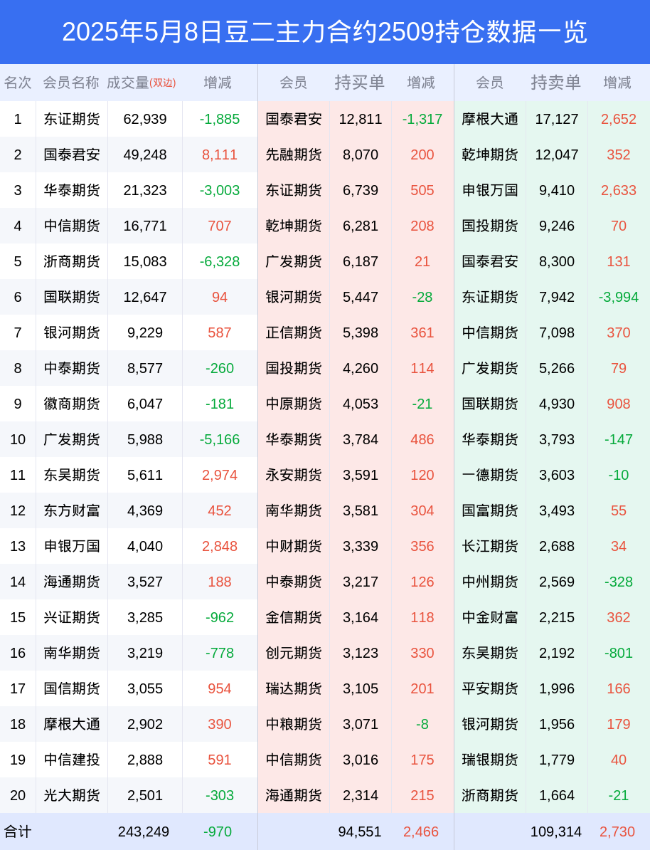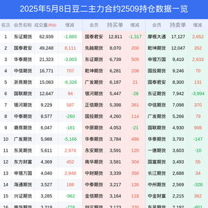 新浪期货 根据交易所数据,截至5月08日收盘主力合约豆二2509,涨跌+0.03%,成交量15.56万手,持仓数据显示前20席位呈现净空,差额头寸为14763手。