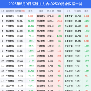 新浪期货 根据交易所数据,截至5月09日收盘主力合约锰硅2509,涨跌+1.20%,成交量23.92万手,持仓数据显示前20席位呈现净空,差额头寸为19163手。