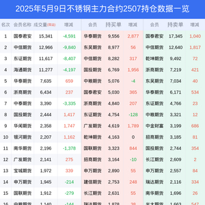 新浪期货 根据交易所数据,截至5月09日收盘主力合约不锈钢2507,涨跌-0.16%,成交量5.50万手,持仓数据显示前20席位呈现净空,差额头寸为7109手。