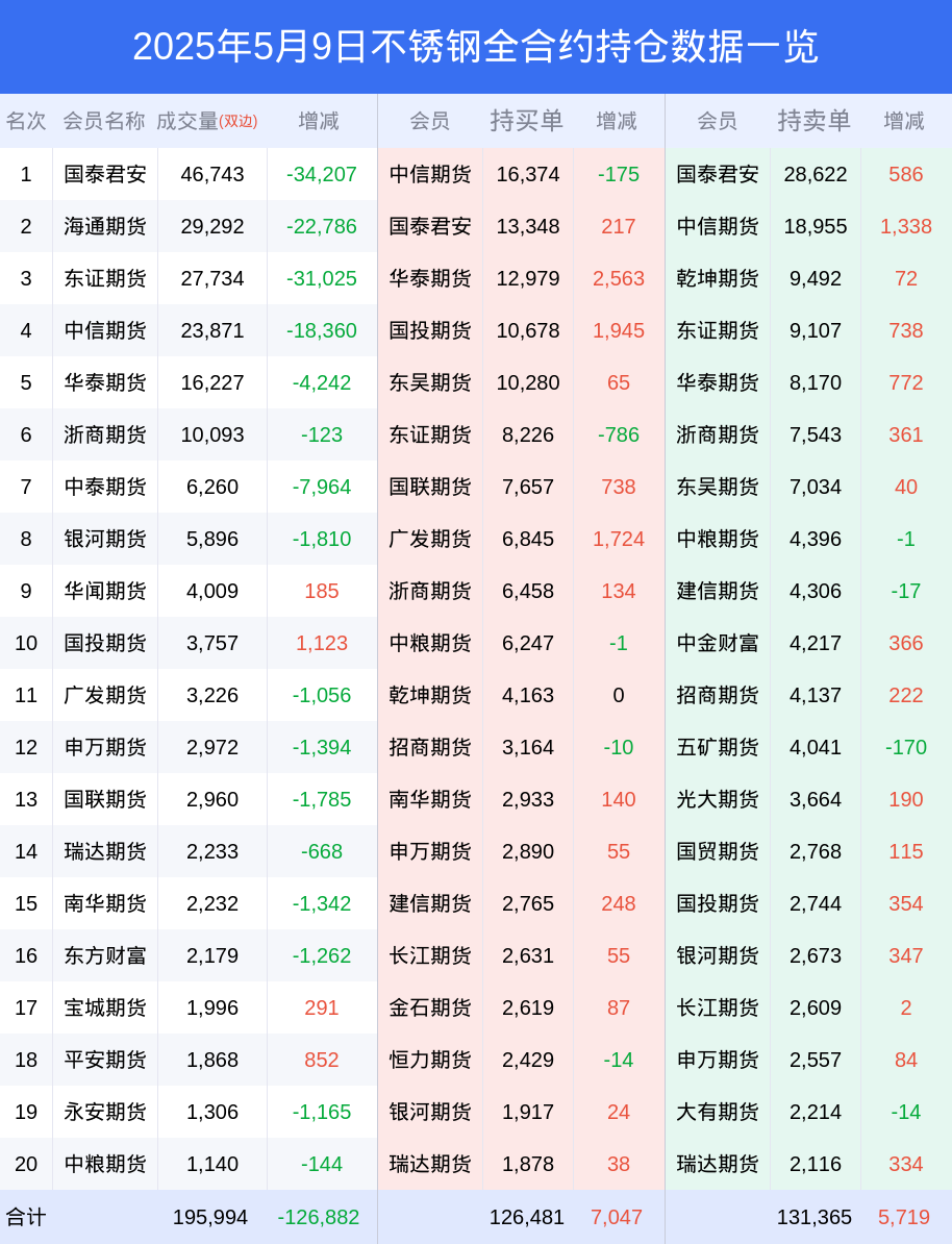 不锈钢期货全合约总计成交13.04万手,比上一日减少8.39万手。全合约前20席位多头持仓13.76万手,比上一日增加6577手。全合约前20席位空头持仓14.65万手,比上一日增加5064手。