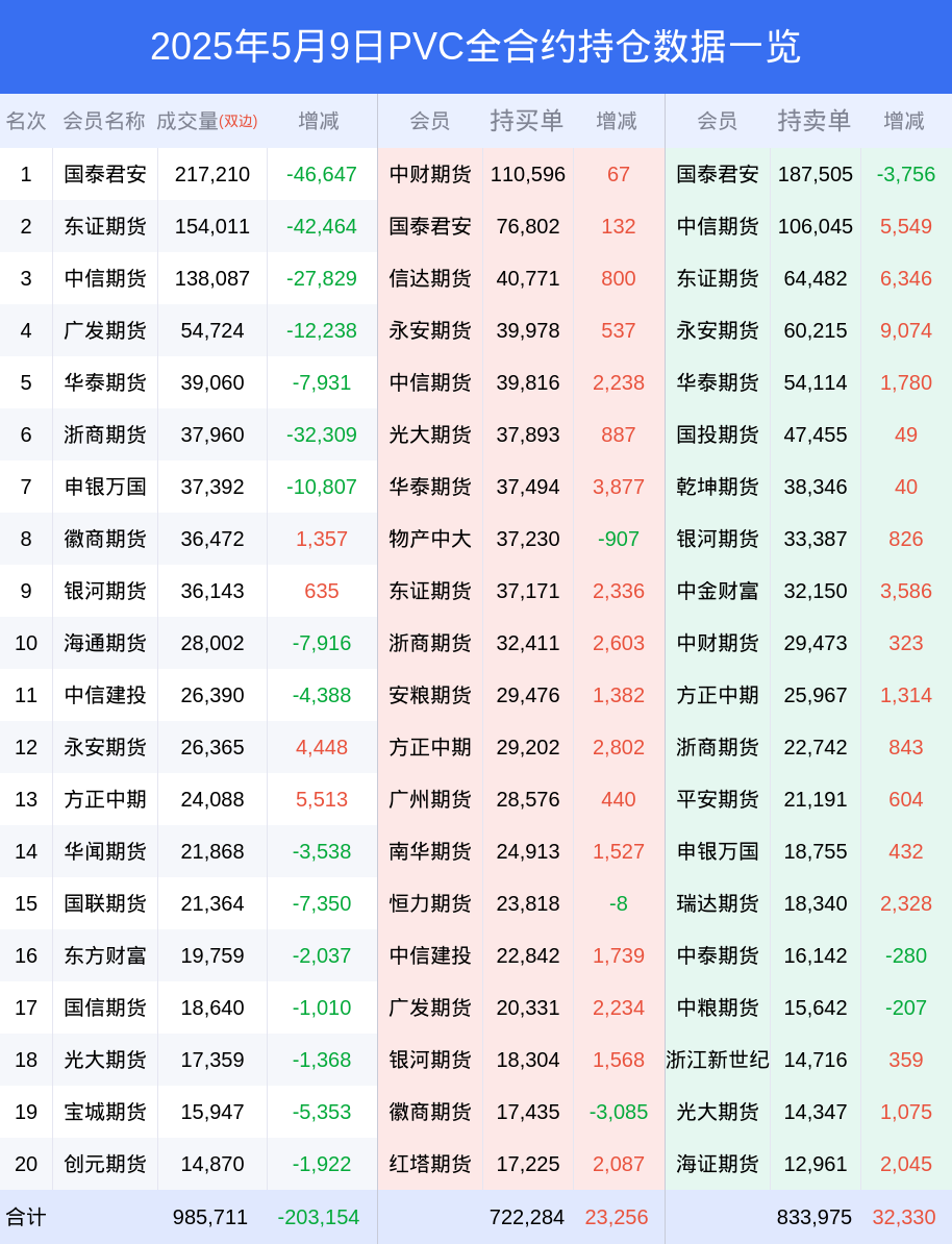 新浪期货 根据交易所数据,截至5月09日收盘主力合约PVC2509,涨跌-0.66%,成交量70.69万手,持仓数据显示前20席位呈现净空,差额头寸为101291手。