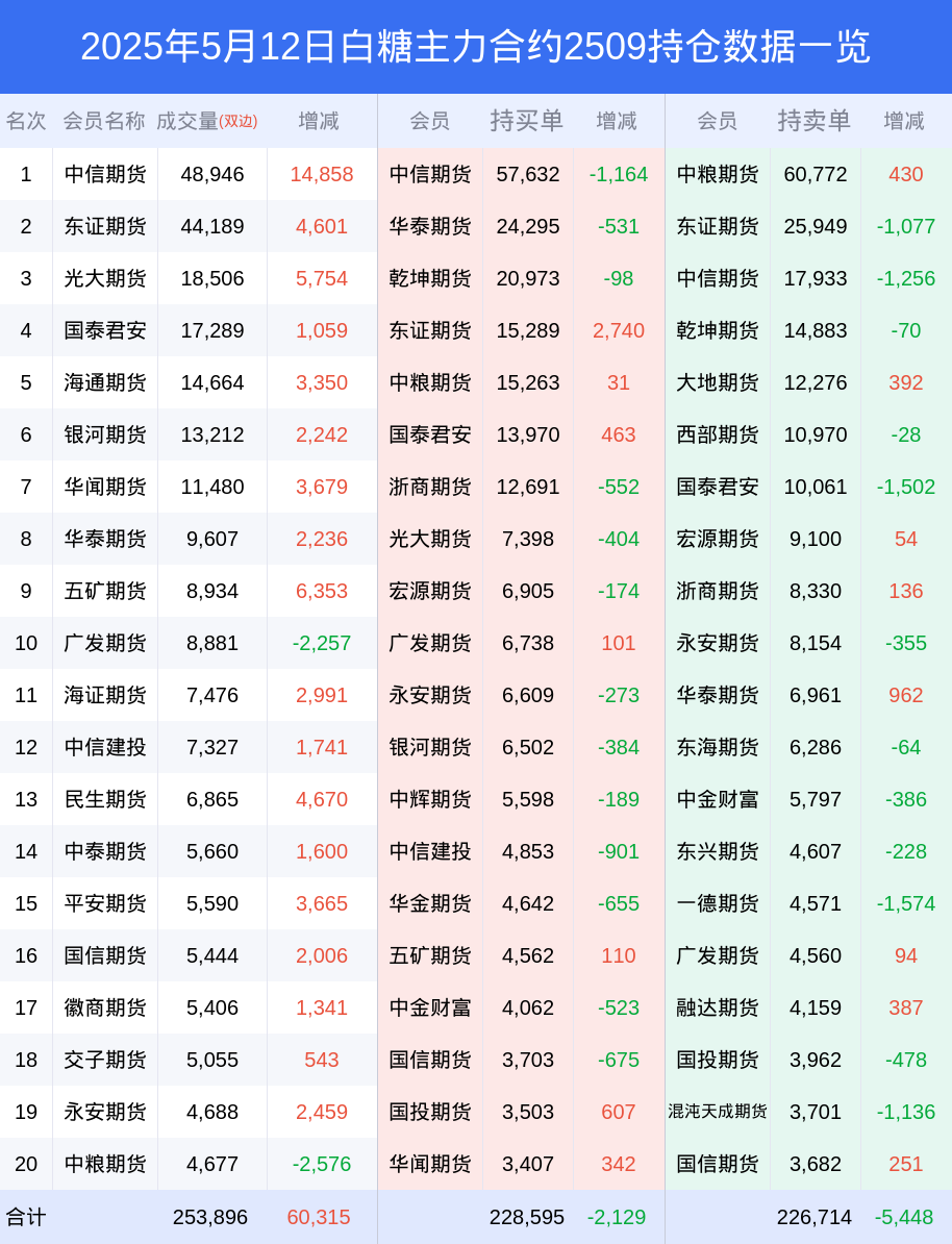 新浪期货 根据交易所数据,截至5月12日收盘主力合约白糖2509,涨跌+0.77%,成交量18.97万手,持仓数据显示前20席位呈现净多,差额头寸为1881手。