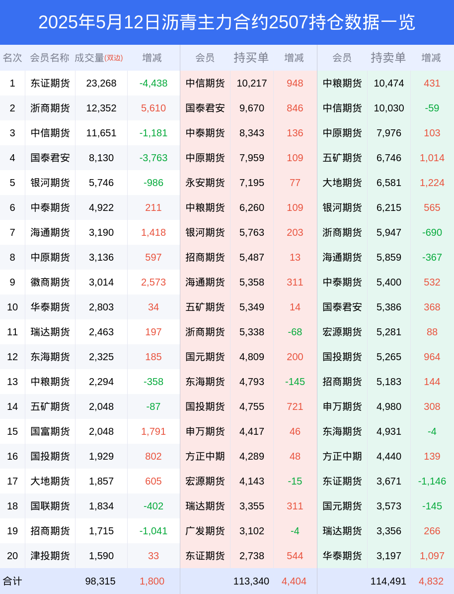 新浪期货 根据交易所数据,截至5月12日收盘主力合约沥青2507,涨跌+1.73%,成交量6.38万手,持仓数据显示前20席位呈现净空,差额头寸为1151手。
