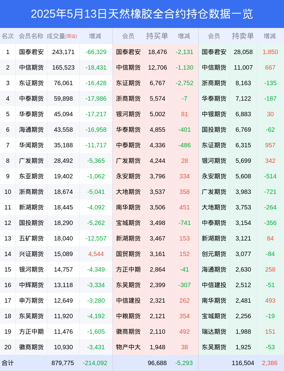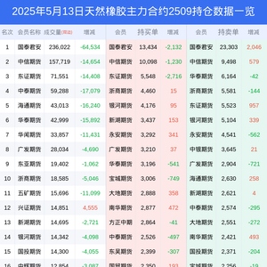 新浪期货 根据交易所数据,截至5月13日收盘主力合约天然橡胶2509,涨跌+1.66%,成交量55.32万手,持仓数据显示前20席位呈现净空,差额头寸为13771手。