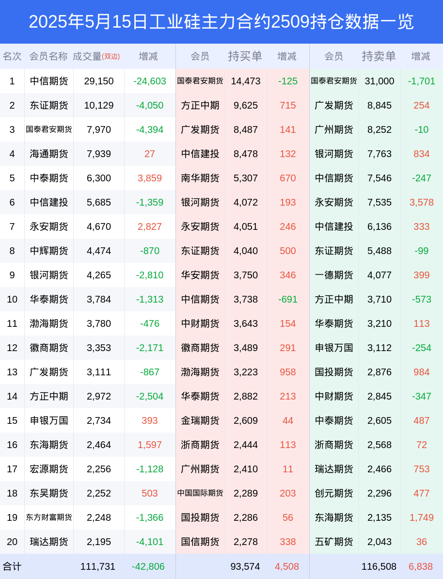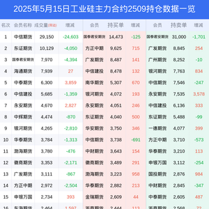 新浪期货 根据交易所数据,截至5月15日收盘主力合约工业硅2509,涨跌+0.41%,成交量8.18万手,持仓数据显示前20席位呈现净空,差额头寸为22934手。