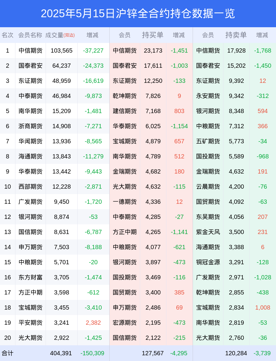 新浪期货 根据交易所数据,截至5月15日收盘主力合约沪锌2506,涨跌+0.31%,成交量15.24万手,持仓数据显示前20席位呈现净空,差额头寸为5629手。