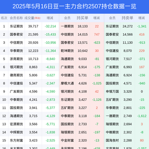 新浪期货 根据交易所数据,截至5月16日收盘主力合约豆一2507,涨跌-0.31%,成交量12.22万手,持仓数据显示前20席位呈现净多,差额头寸为692手。