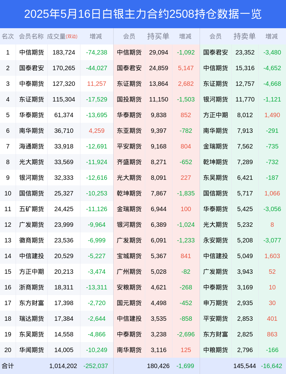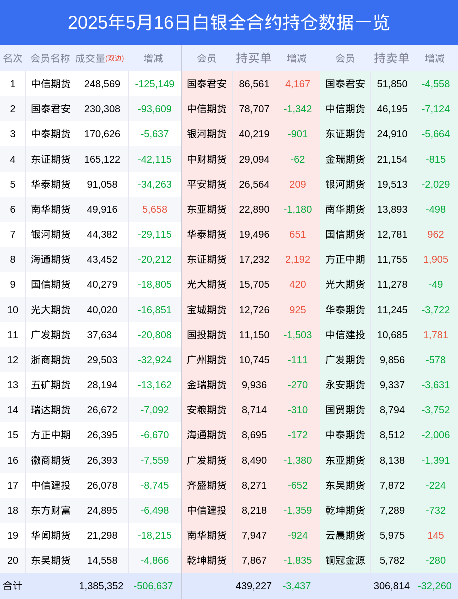 新浪期货 根据交易所数据,截至5月16日收盘主力合约白银2508,涨跌+0.61%,成交量72.01万手,持仓数据显示前20席位呈现净多,差额头寸为34882手。