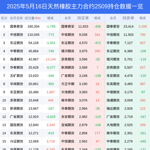 新浪期货 根据交易所数据,截至5月16日收盘主力合约天然橡胶2509,涨跌-1.55%,成交量41.02万手,持仓数据显示前20席位呈现净空,差额头寸为22128手。