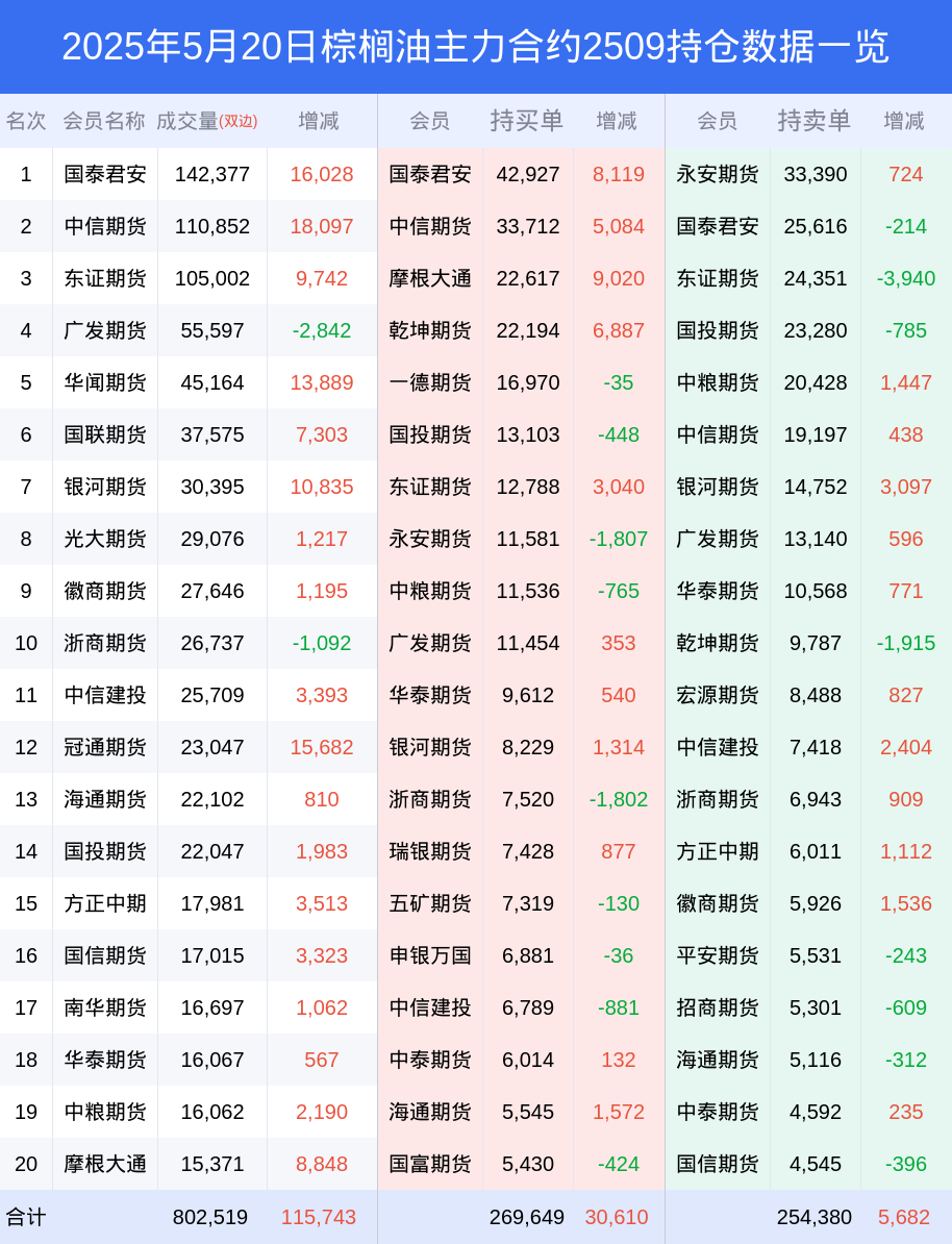 新浪期货 根据交易所数据,截至5月20日收盘主力合约棕榈油2509,涨跌+1.25%,成交量63.18万手,持仓数据显示前20席位呈现净多,差额头寸为15269手。