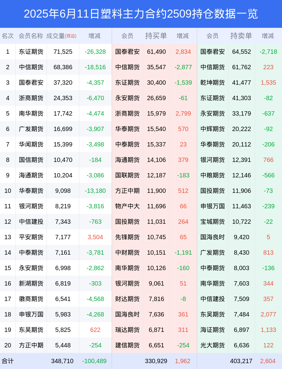 新浪期货 根据交易所数据,截至6月11日收盘主力合约塑料2509,涨跌+0.04%,成交量25.32万手,持仓数据显示前20席位呈现净空,差额头寸为72288手。