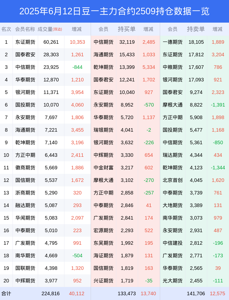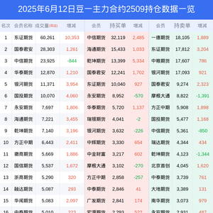 新浪期货 根据交易所数据,截至6月12日收盘主力合约豆一2509,涨跌+0.57%,成交量16.73万手,持仓数据显示前20席位呈现净空,差额头寸为8233手。