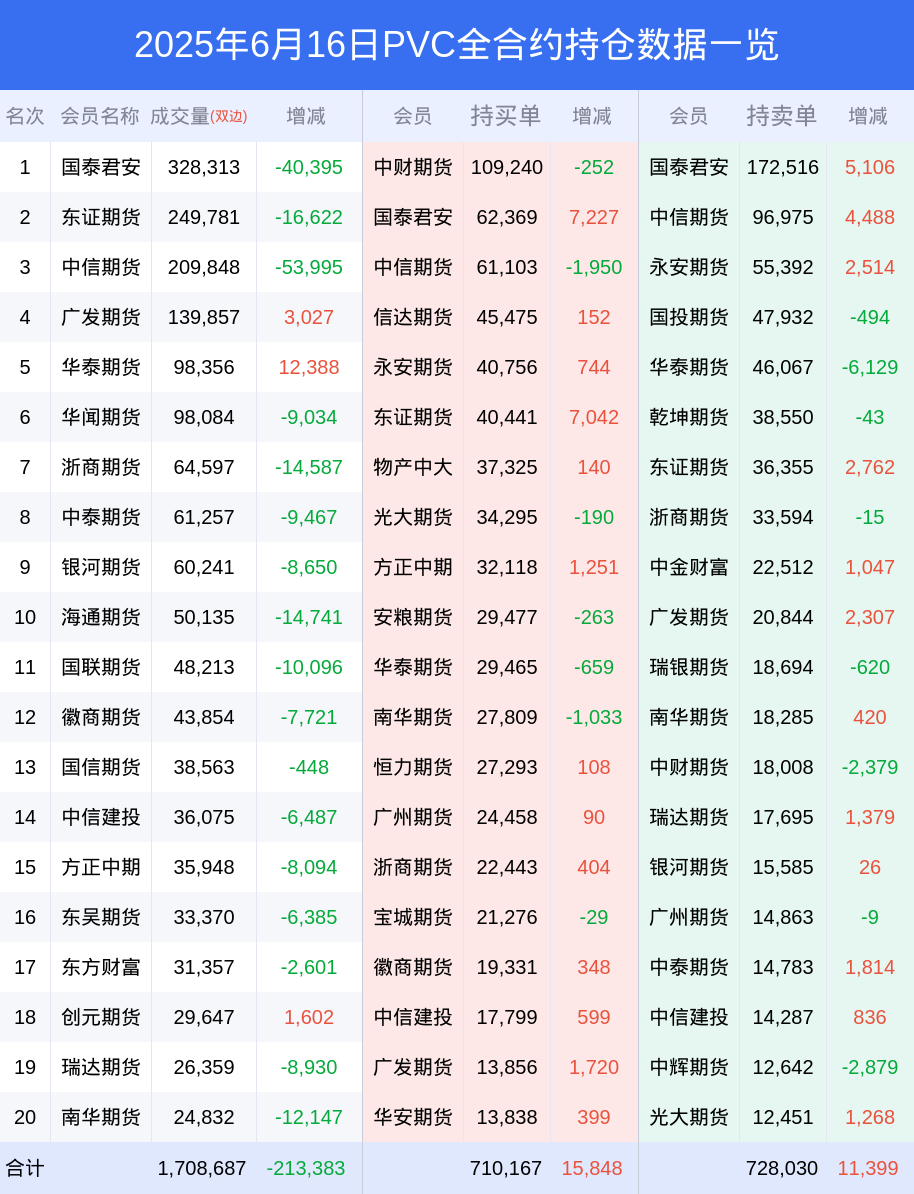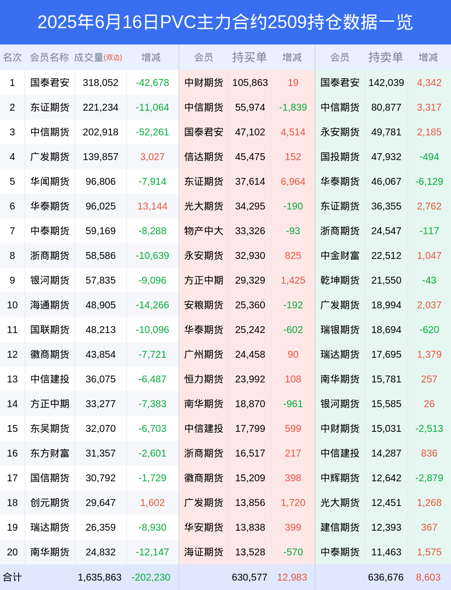 新浪期货 根据交易所数据,截至6月16日收盘主力合约PVC2509,涨跌+0.35%,成交量119.46万手,持仓数据显示前20席位呈现净空,差额头寸为6099手。