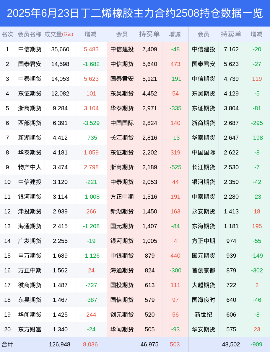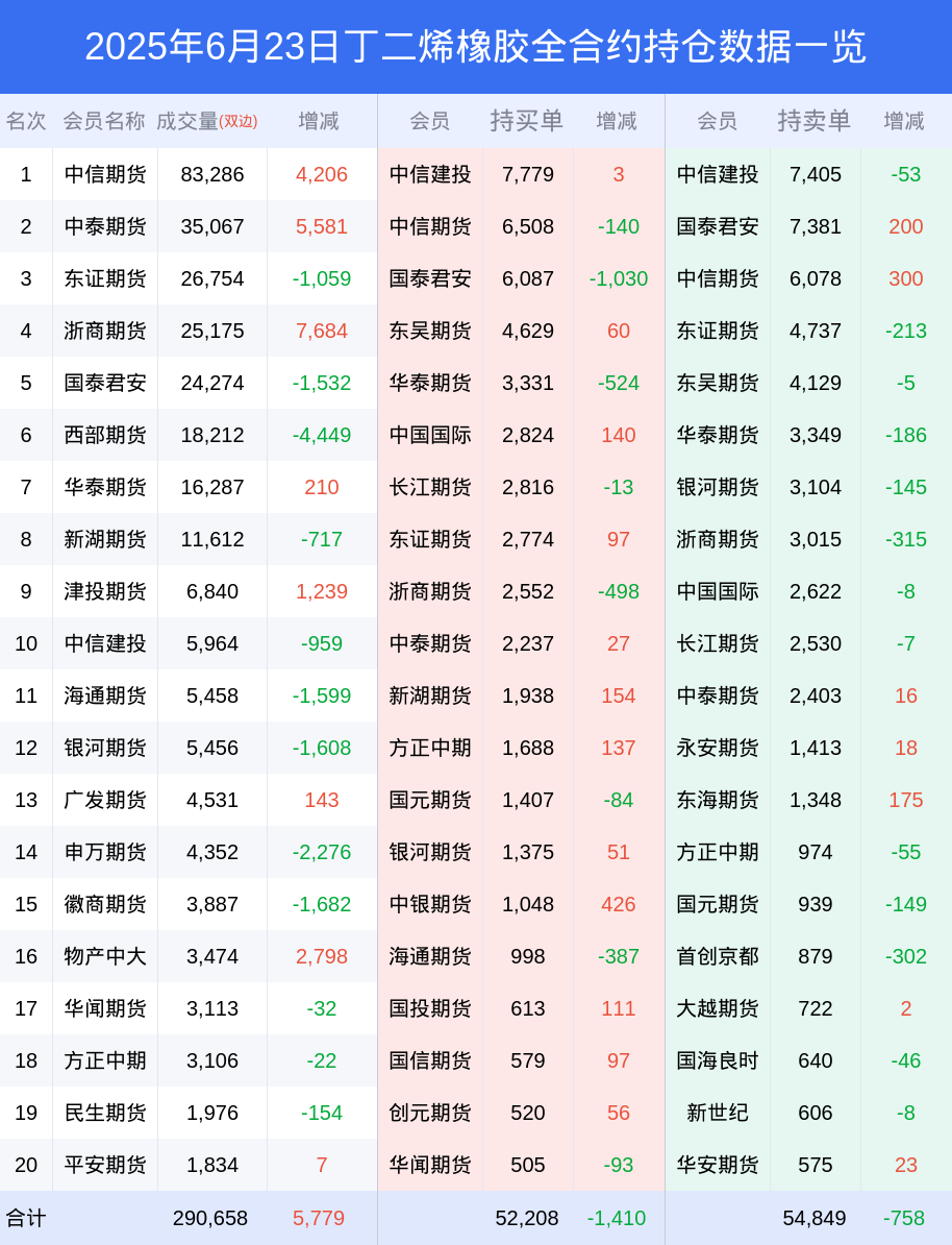 新浪期货 根据交易所数据,截至6月23日收盘主力合约丁二烯橡胶2508,涨跌-1.16%,成交量8.14万手,持仓数据显示前20席位呈现净空,差额头寸为1527手。