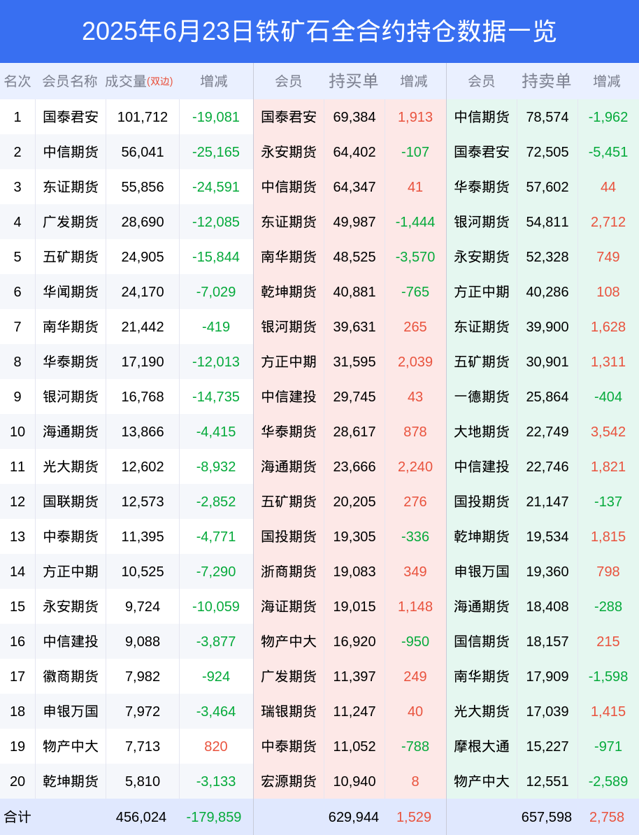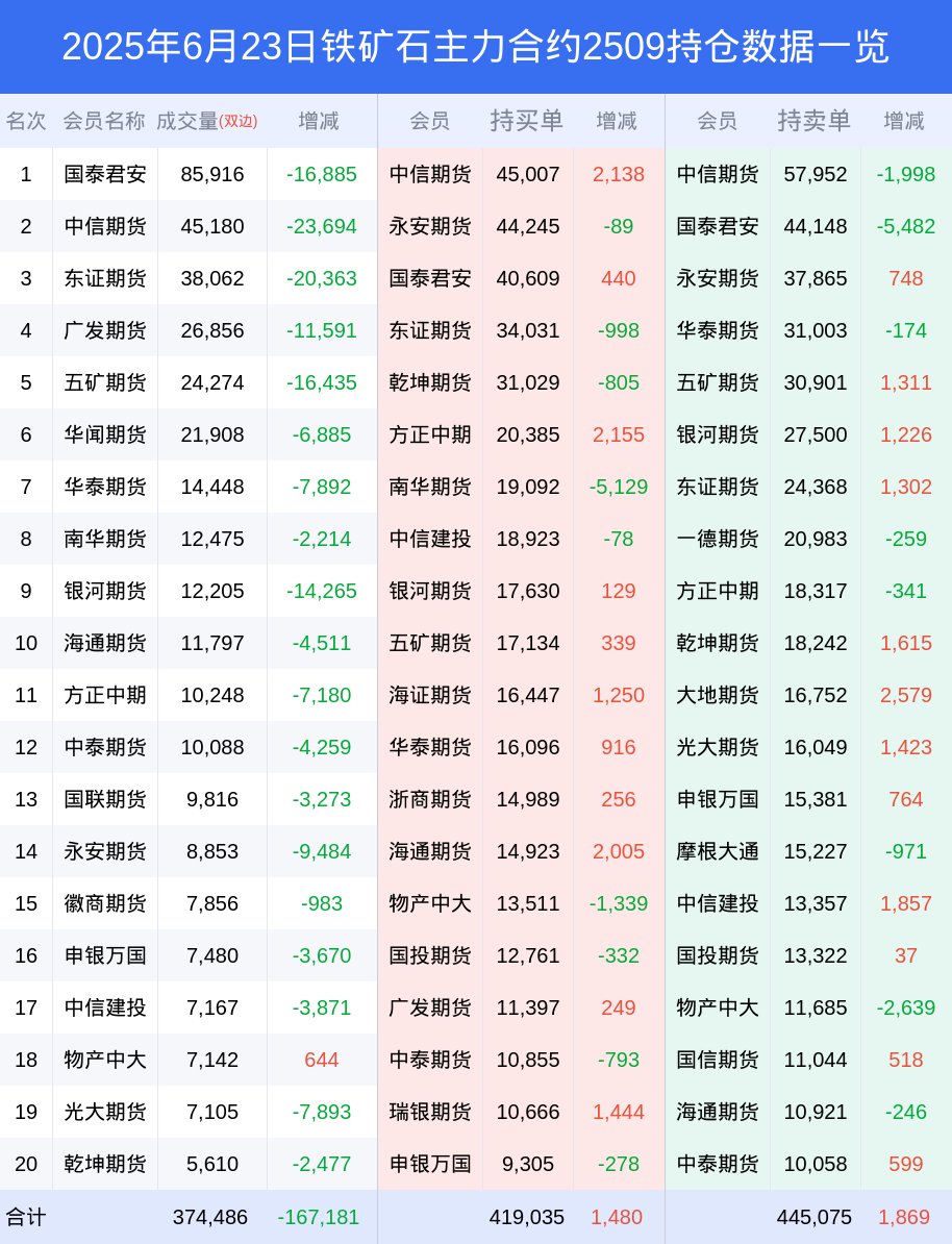 新浪期货 根据交易所数据,截至6月23日收盘主力合约铁矿石2509,涨跌+0.50%,成交量27.34万手,持仓数据显示前20席位呈现净空,差额头寸为26040手。