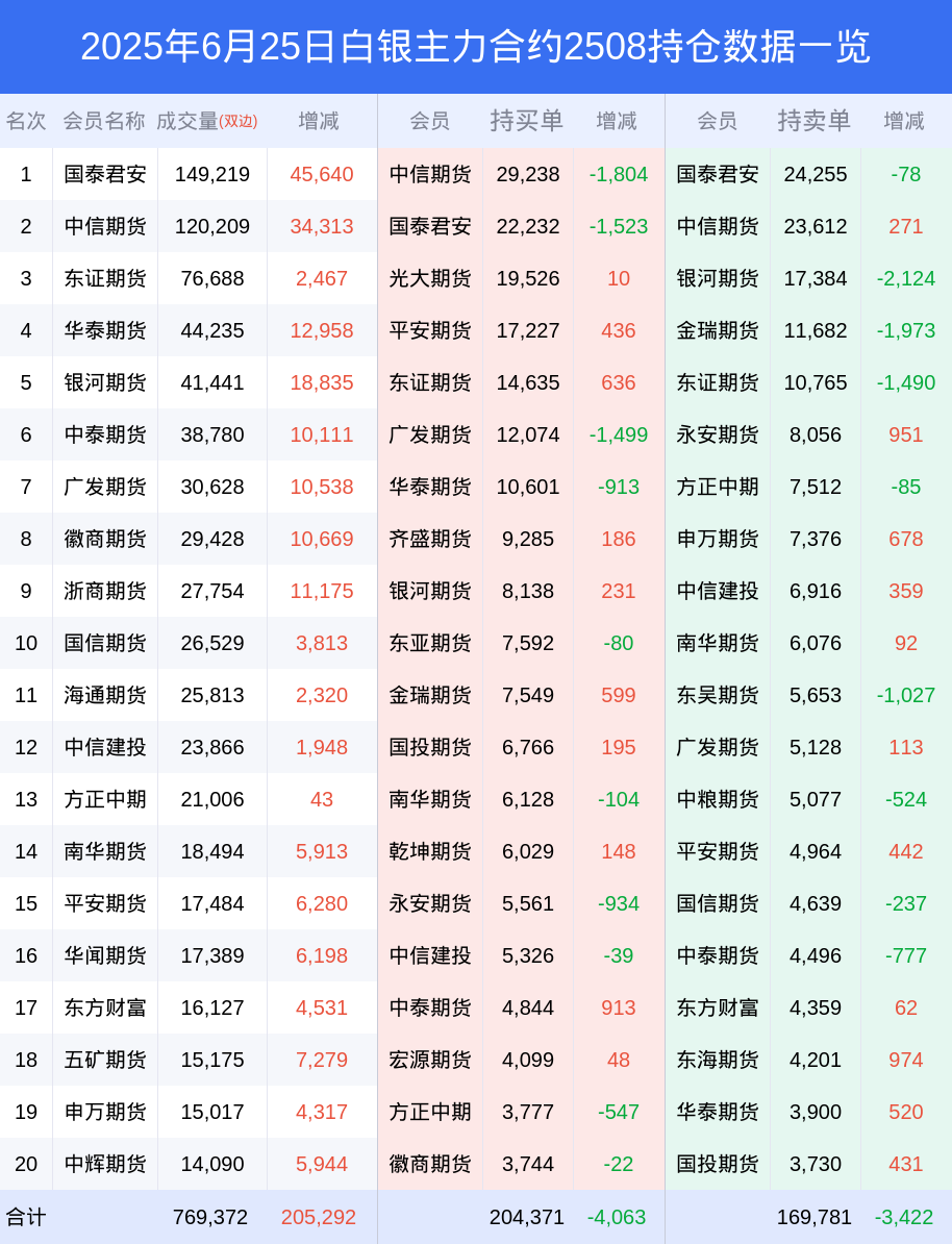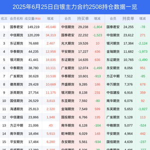 新浪期货 根据交易所数据,截至6月25日收盘主力合约白银2508,涨跌-0.44%,成交量60.64万手,持仓数据显示前20席位呈现净多,差额头寸为34590手。