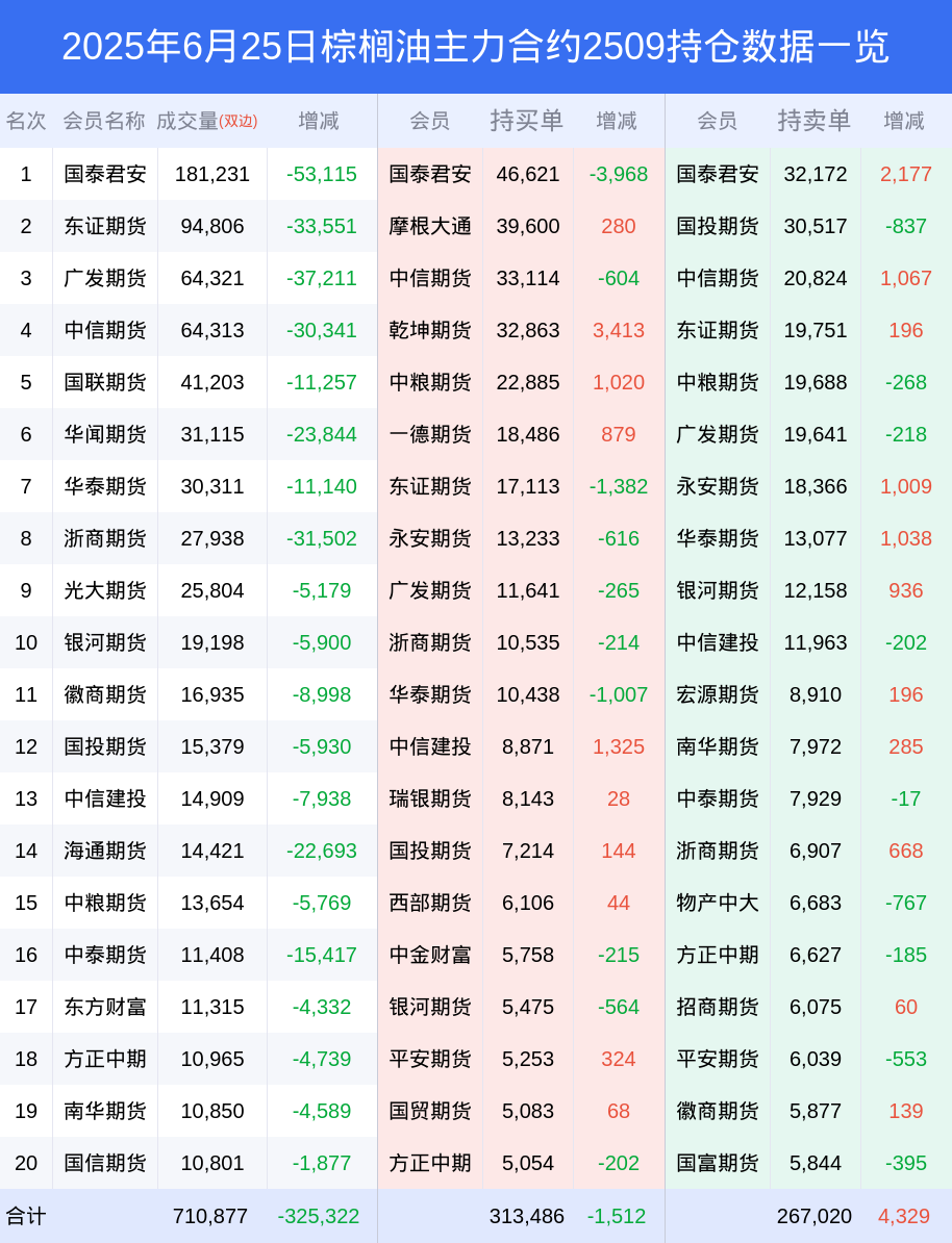 新浪期货 根据交易所数据,截至6月25日收盘主力合约棕榈油2509,涨跌-0.36%,成交量50.19万手,持仓数据显示前20席位呈现净多,差额头寸为46466手。