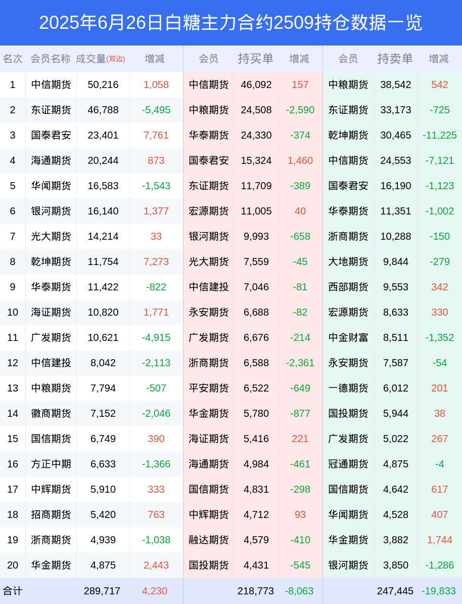 新浪期货 根据交易所数据,截至6月26日收盘主力合约白糖2509,涨跌+1.10%,成交量21.90万手,持仓数据显示前20席位呈现净空,差额头寸为28672手。