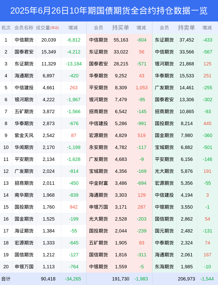 新浪期货 根据交易所数据,截至6月26日收盘主力合约10年期国债期货2509,涨跌-0.02%,成交量5.22万手,持仓数据显示前20席位呈现净空,差额头寸为12059手。