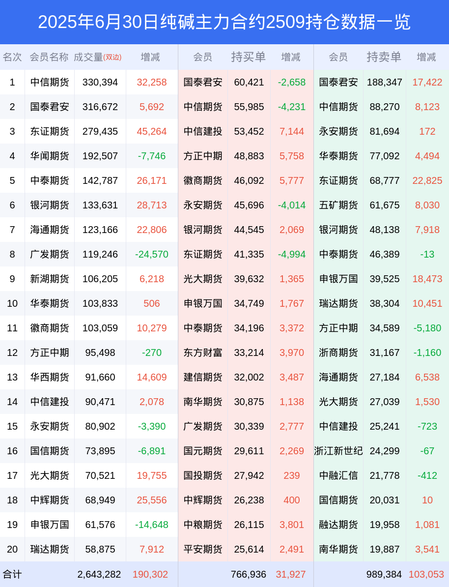 新浪期货 根据交易所数据,截至6月30日收盘主力合约纯碱2509,涨跌-0.92%,成交量226.04万手,持仓数据显示前20席位呈现净空,差额头寸为222448手。