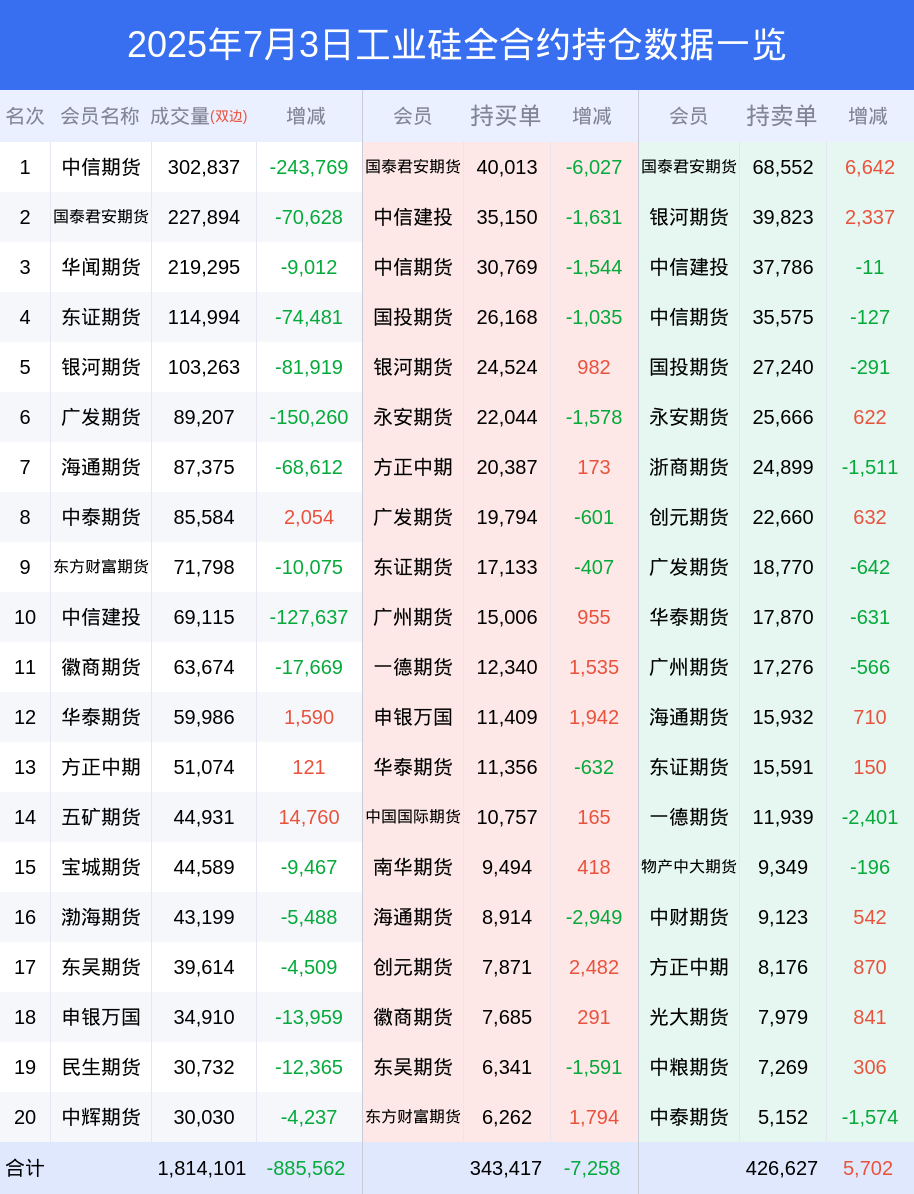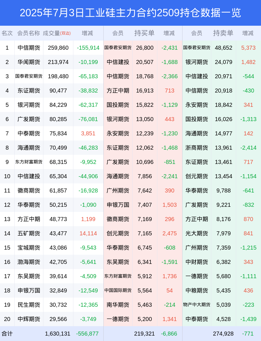 新浪期货 根据交易所数据,截至7月03日收盘主力合约工业硅2509,涨跌-0.93%,成交量119.65万手,持仓数据显示前20席位呈现净空,差额头寸为55607手。