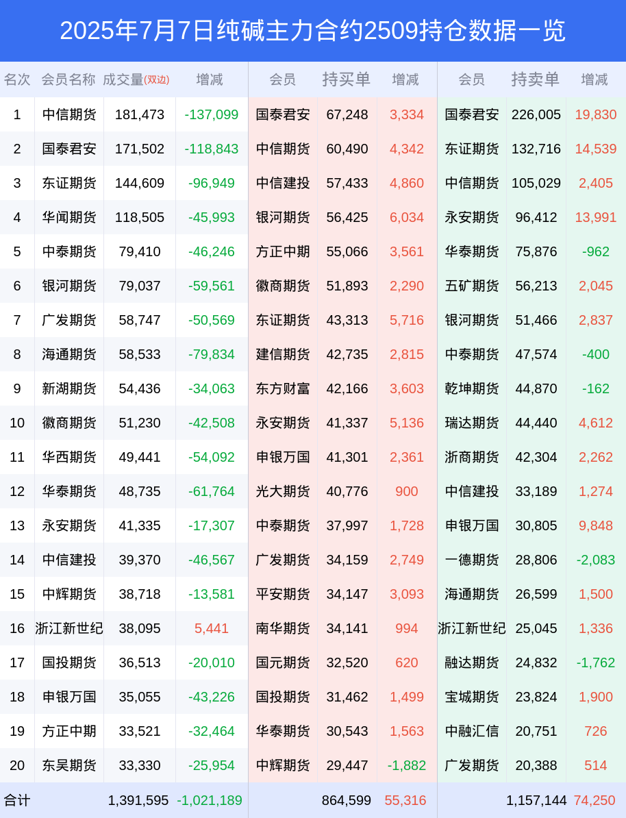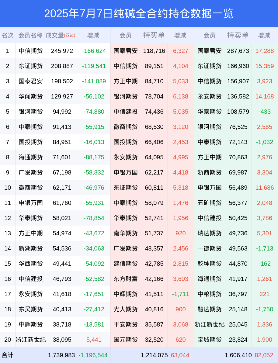 纯碱期货全合约总计成交146.09万手,比上一日减少116.24万手。全合约前20席位多头持仓136.73万手,比上一日增加6.72万手。全合约前20席位空头持仓179.46万手,比上一日增加8.73万手。