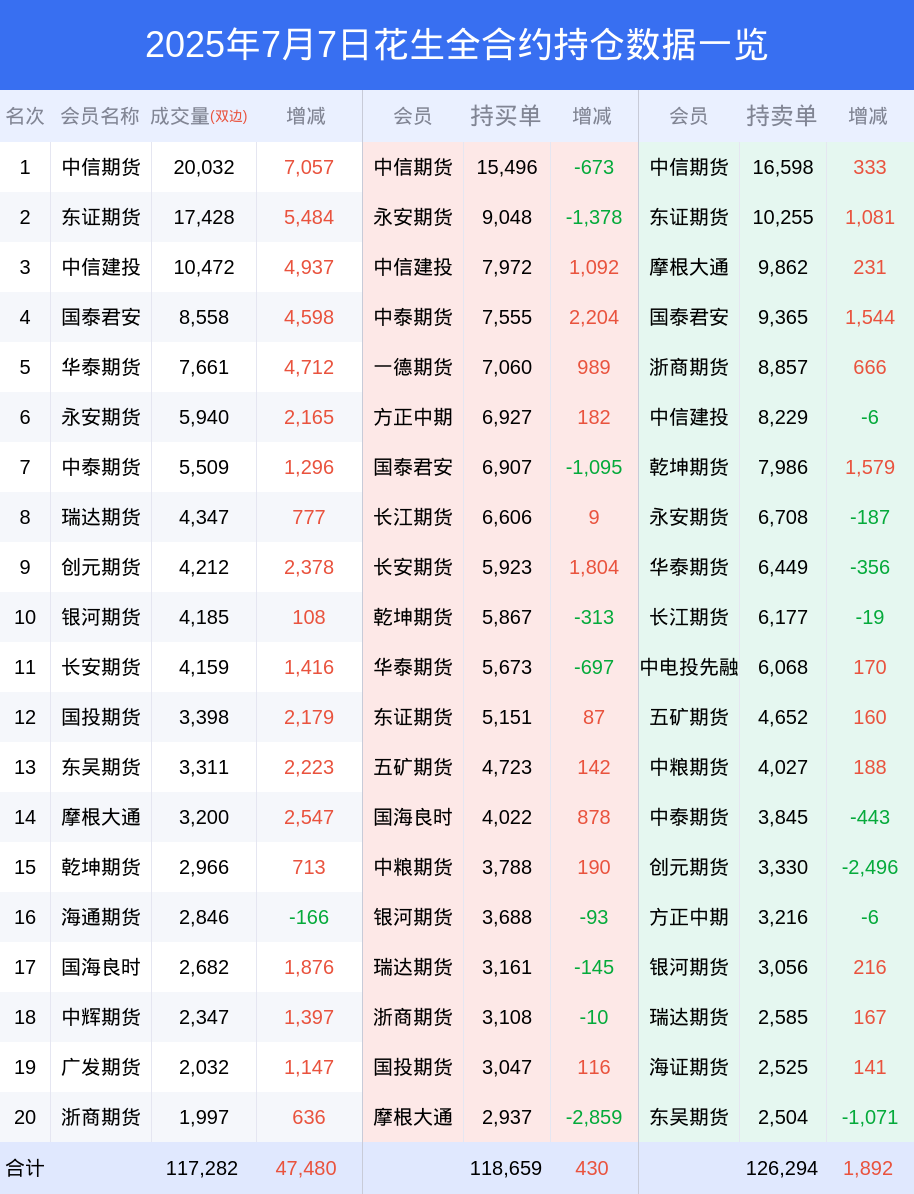 新浪期货 根据交易所数据,截至7月07日收盘主力合约花生2510,涨跌-1.46%,成交量7.36万手,持仓数据显示前20席位呈现净空,差额头寸为5374手。