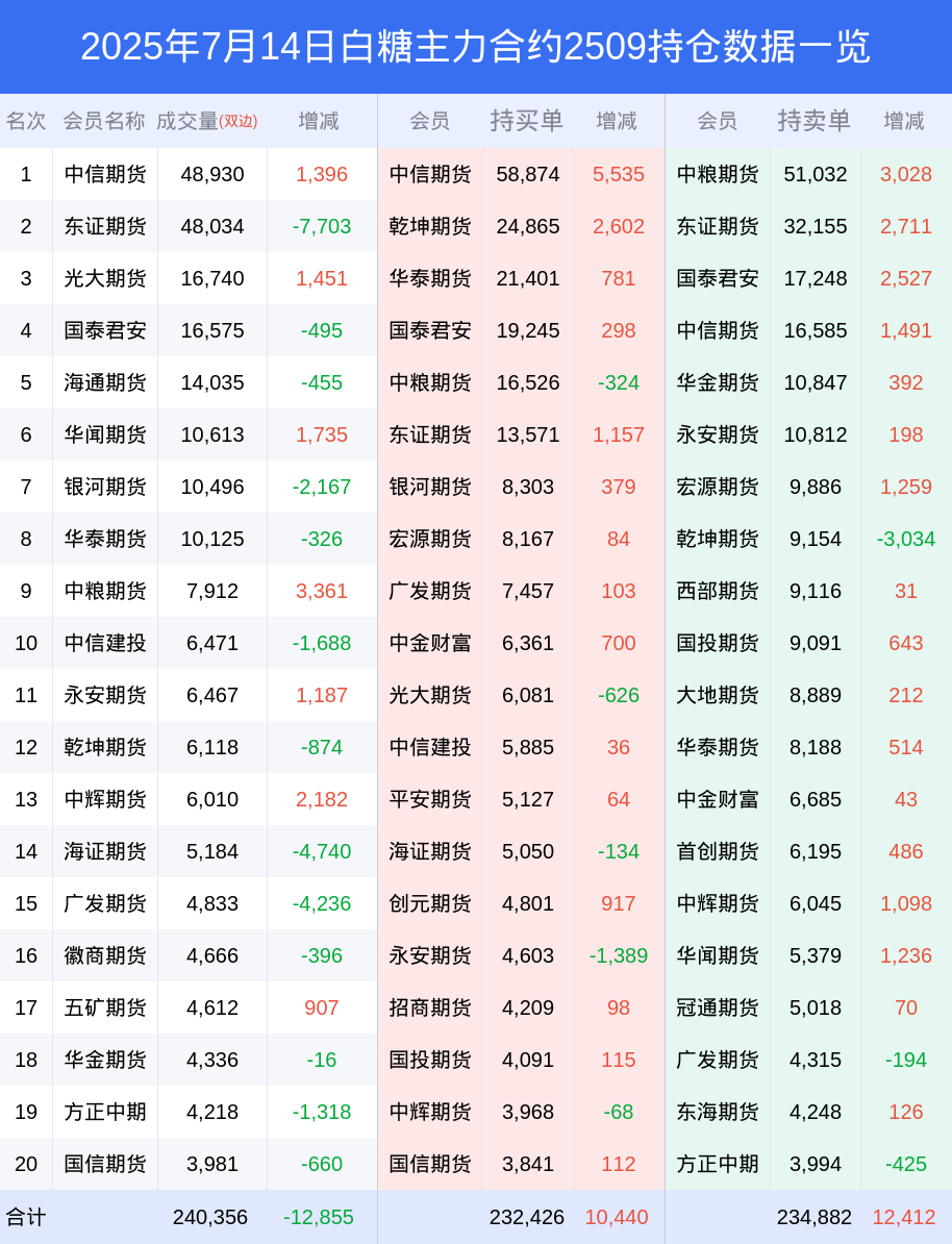 新浪期货 根据交易所数据,截至7月14日收盘主力合约白糖2509,涨跌+0.15%,成交量17.60万手,持仓数据显示前20席位呈现净空,差额头寸为2456手。