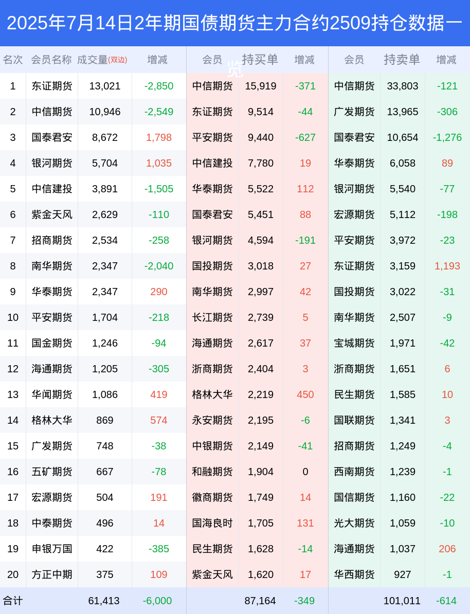新浪期货 根据交易所数据,截至7月14日收盘主力合约2年期国债期货2509,涨跌-0.03%,成交量3.31万手,持仓数据显示前20席位呈现净空,差额头寸为13847手。
