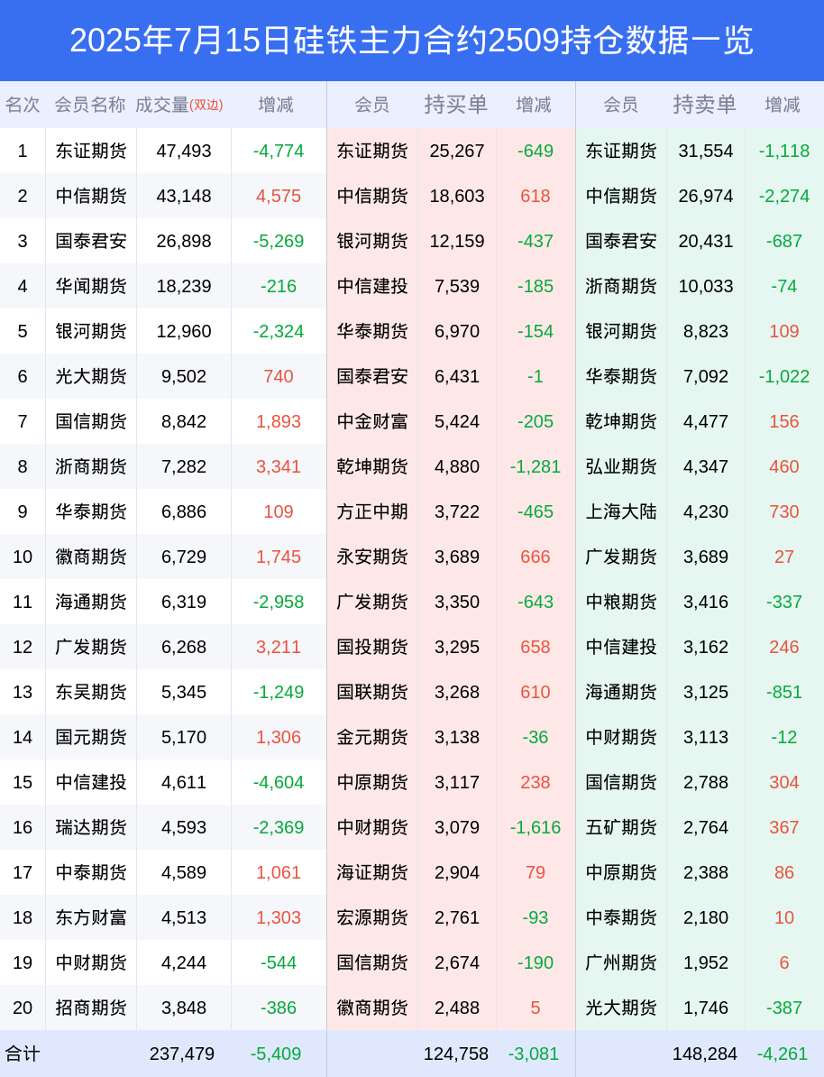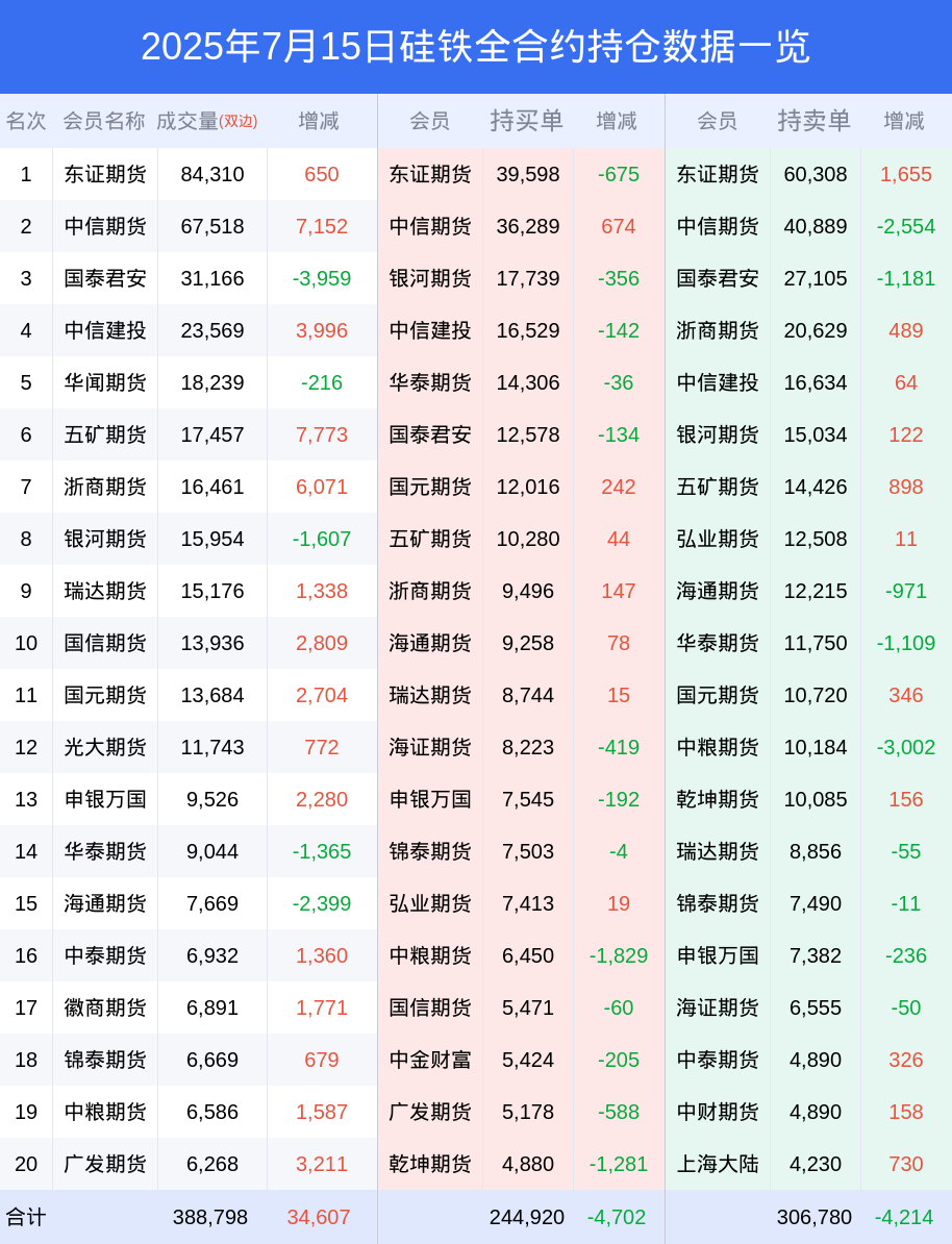 新浪期货 根据交易所数据,截至7月15日收盘主力合约硅铁2509,涨跌+0.33%,成交量16.75万手,持仓数据显示前20席位呈现净空,差额头寸为23526手。