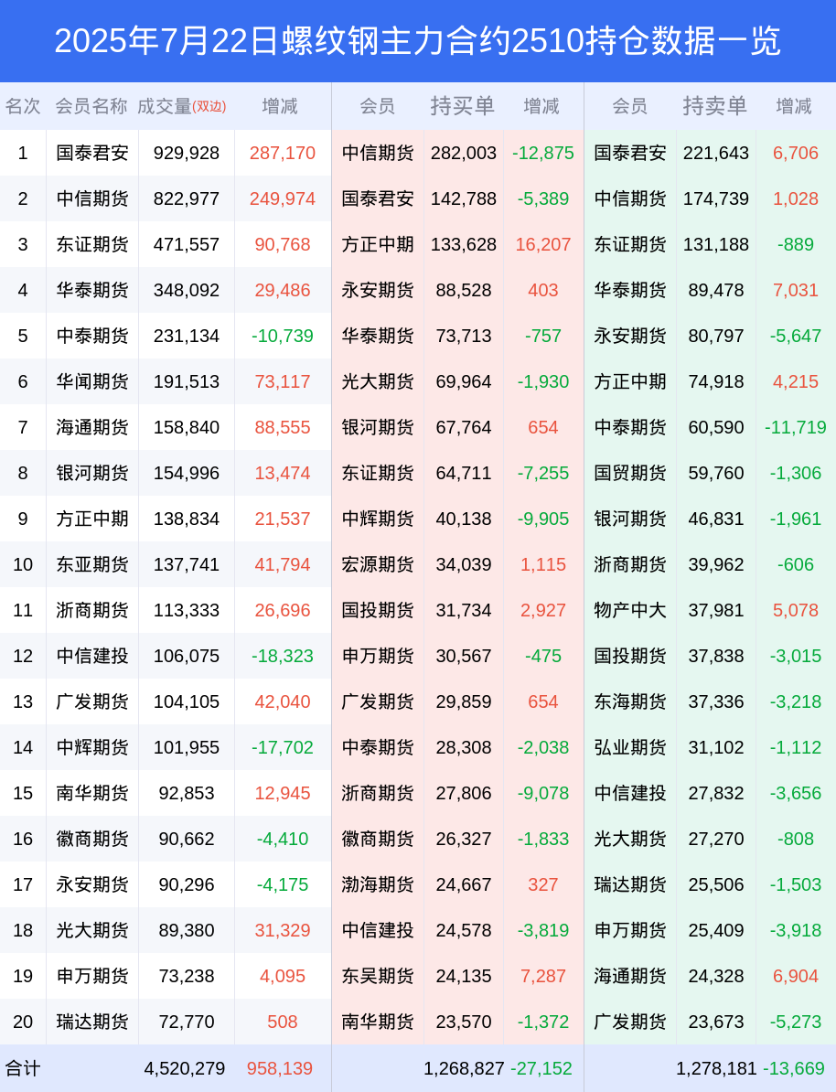 新浪期货 根据交易所数据,截至7月22日收盘主力合约螺纹钢2510,涨跌+3.12%,成交量326.67万手,持仓数据显示前20席位呈现净空,差额头寸为9354手。