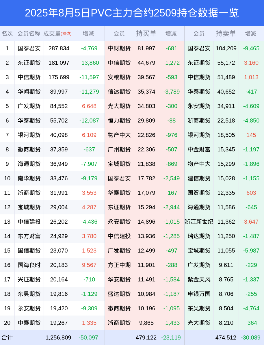 PVC期货全合约总计成交122.63万手,比上一日减少3.00万手。全合约前20席位多头持仓79.32万手,比上一日减少1.03万手。全合约前20席位空头持仓82.18万手,比上一日减少1.79万手。
