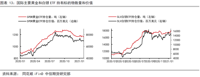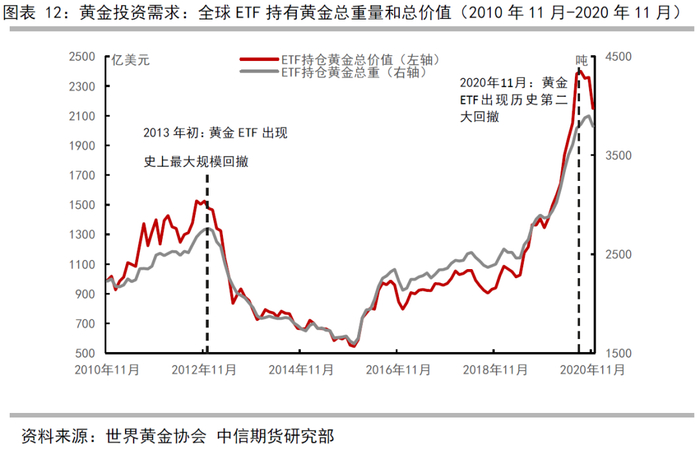 我们发现可以尝试使用黄金的投资性需求指标——黄金ETF持仓验证经济复苏期时黄金价格是否到达拐点(图表12)。黄金ETF代表了黄金的投资性需求,投资期限一般为长期,不太会因为价格的短暂波动改变。我们发现,2013年美国经济进入复苏期,黄金出现趋势下跌前,全球黄金ETF持有黄金量出现了趋势拐点,由图表12可知,2012年12月至2013年4月,全球黄金ETF黄金持有量出现了历史最大跌幅。而2020年11月,全球黄金ETF持有黄金量也开始出现了类似于2013年的情况,出现历史第二大回撤,ETF持有黄金量由3878吨下降至3792.86吨。这表明,黄金的价格走势或许已经类似于2013年经济复苏期的情况,价格已经开始提前反映复苏预期。