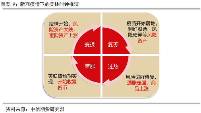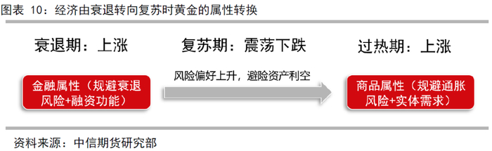 由于黄金由美元定价,所以金价主要考察美国经济。美国在复苏过程中的风险偏好与资产价格变化过程可以用美林时钟模型分析(图表9),该模型以美联储的两个政策目标:经济增长和通货膨胀为目标变量,可以用来解释并推演此次疫情的中的黄金属性转化和价格变化(图表10)。