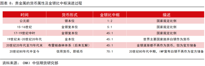 而再看白银,从图表8可以发现,上世纪80年代中,国际货币基金组织已经将白银剔除出了官方储备,所以白银相比黄金而言,是缺乏“准货币”属性的。因此我们总是可以看到,黄金价格上涨时白银总是追随黄金。
