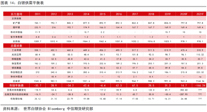 我们根据已知的信息对白银的供需情况进行极端假设。假设2021年供给情况最差,白银供给与2020年疫情期间一致,仍为978.1Moz。假设需求情况最好,按照世界白银协会报告预估,白银珠宝需求和工业需求将在2022年恢复2019年的水平,我们假设2021年即可恢复。同时假设全球光伏的安装数量均与中国一致,光伏用银上涨20%,再假设实物白银投资上升20%,据此建立白银的供需平衡表。