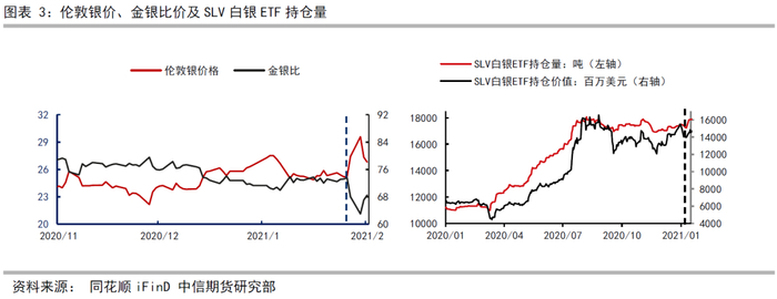 (3)金银价格比值出现持续下降。在WSB事件发生前两月,伦敦金银价比值在75左右,近10年来中位数在70左右。当WSB入场后,金银价格比迅速出现下跌,由1月28日的73.54迅速下跌至2月1日的62.97。短短三个交易日内,下跌10.57个点,与WSB的金银比逻辑一致。