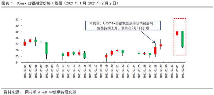 近期白银出现极端行情。起因是WallStreetBets论坛有部分新帖称白银将成为“轧空”下一目标。受之前“轧空”游戏驿站事件的影响,白银价格自1月28日开始上涨,2月1日出现“引爆”,Comex白银价格由28.425上涨至29.250美元/盎司,涨幅8.09%;沪银主力合约当日跳空高开5654上涨至5939元/克,涨幅8.40%。创2008年以来最大涨幅。